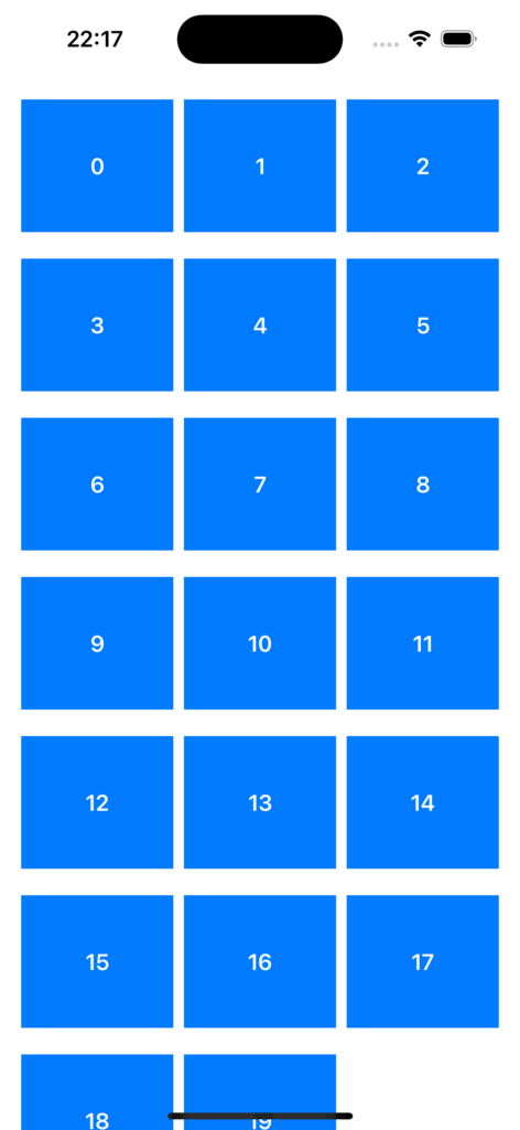 「Lazy(遅延)」という名前には重要な意味があります。LazyVGridは、画面に表示される要素だけをその都度生成するため、大量のデータを扱う場合でもパフォーマンスが優れています。
